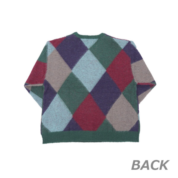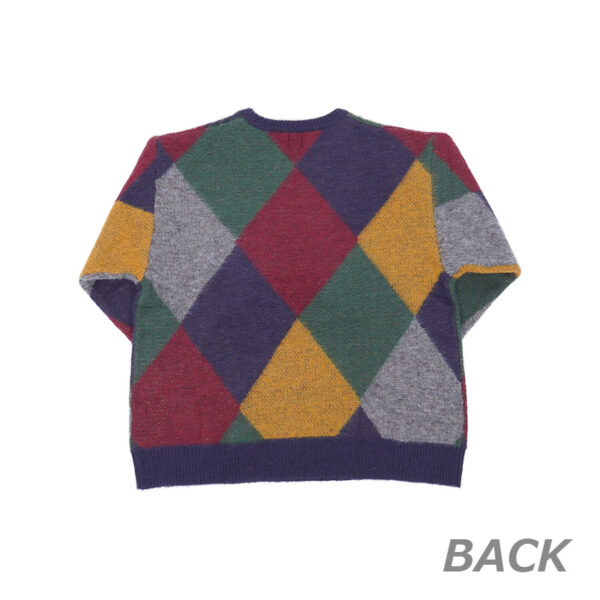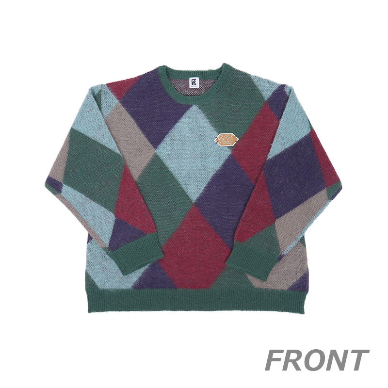 素材はナイロン45% アクリル40% ウール10% モヘア5%で、大判のアーガイル柄が特徴的なデザインで、胸元にはワッペンをあしらったニット。 モヘア混の糸を使用しているので、ふわふわした風合いで着心地抜群です。