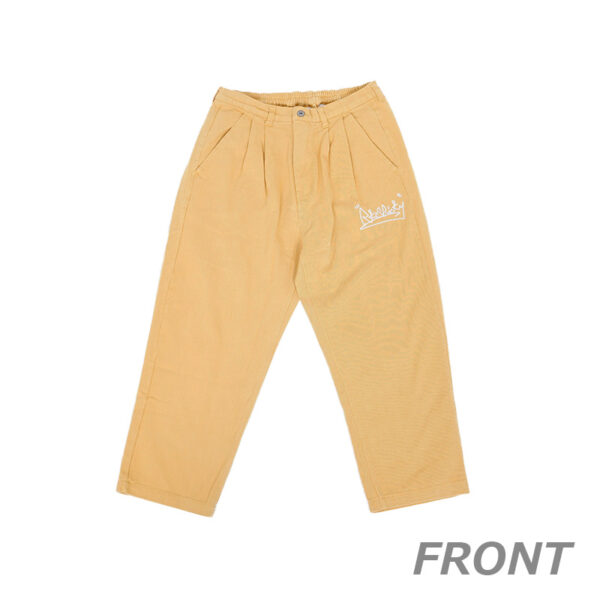 素材は綿100%。 RKSカラーワイドパンツは裾にかけて緩やかにテーパードが効いた形で、 ワイドシルエットに仕上げた足元がスッキリと見えるパンツです。 春らしく鮮やかな色合いのパンツで、履くだけで気分が上がるイエローと、いつものコーデにフレッシュ感を与えるグリーンの2色展開。 性別問わずご着用いただけます。